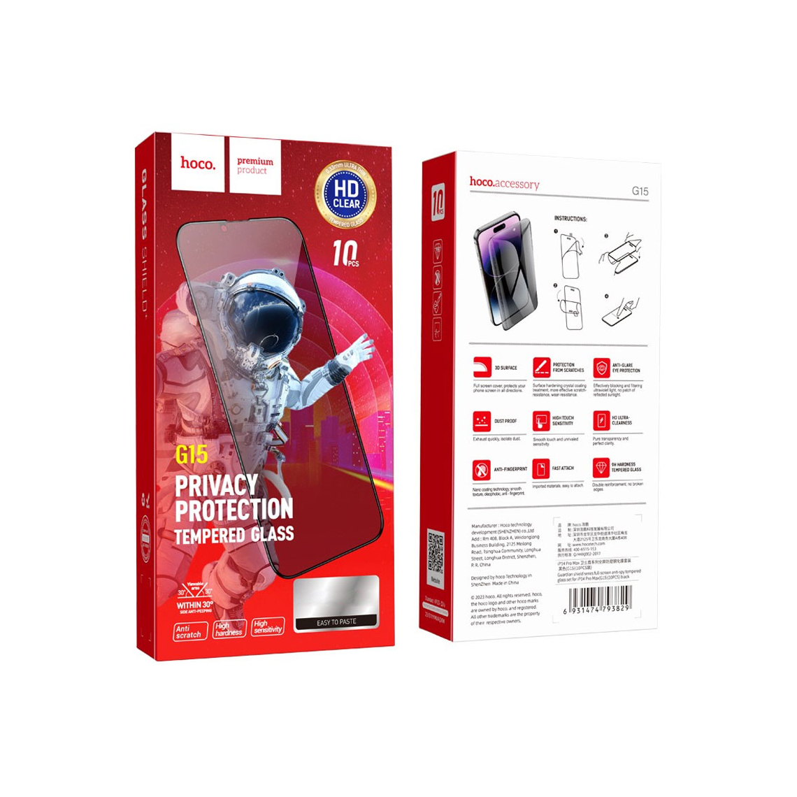 Protejează-ți confidențialitatea și ecranul iPhone 11 Pro Max sau Xs Max cu setul de 10 folii de sticlă privacy Hoco G15 Guardian! Realizate din sticlă temperată de înaltă calitate, aceste folii oferă o protecție superioară împotriva zgârieturilor, impacturilor și prafului, prelungind durata de viață a ecranului tău. Tehnologia privacy avansată limitează unghiul de vizualizare la 45 de grade, astfel încât doar tu poți vedea conținutul ecranului, protejând informațiile sensibile de ochii curioșilor din jur – ideal pentru utilizarea în transportul public, cafenele sau birouri aglomerate. Fiecare folie din setul Hoco G15 Guardian este proiectată pentru o potrivire perfectă cu iPhone 11 Pro Max și Xs Max, acoperind integral ecranul și lăsând accesibile toate funcțiile telefonului. Aplicarea este simplă și rapidă, fără bule de aer, datorită adezivului siliconic de calitate. Setul include 10 folii, asigurându-ți o protecție de lungă durată și o rezervă consistentă. Beneficiezi de claritate HD, sensibilitate tactilă excelentă și rezistență sporită la amprente. Alege Hoco G15 Guardian pentru o protecție completă, discretă și eficientă a ecranului tău. Profită de acest pachet economic și asigură-ți liniștea știind că telefonul tău este protejat de zgârieturi și de privirile indiscrete. Nu mai aștepta, comandă acum setul tău de 10 folii de sticlă privacy Hoco G15 Guardian și bucură-te de un ecran protejat și de confidențialitate garantată! Fiecare folie este ambalată individual pentru a asigura integritatea produsului până la momentul utilizării. De asemenea, pachetul include un kit de curățare pentru a pregăti ecranul înainte de aplicare. Instrucțiunile de aplicare sunt incluse în pachet, facilitând procesul chiar și pentru cei mai puțin experimentați. Cu Hoco G15 Guardian, protecția și confidențialitatea ecranului tău sunt asigurate!