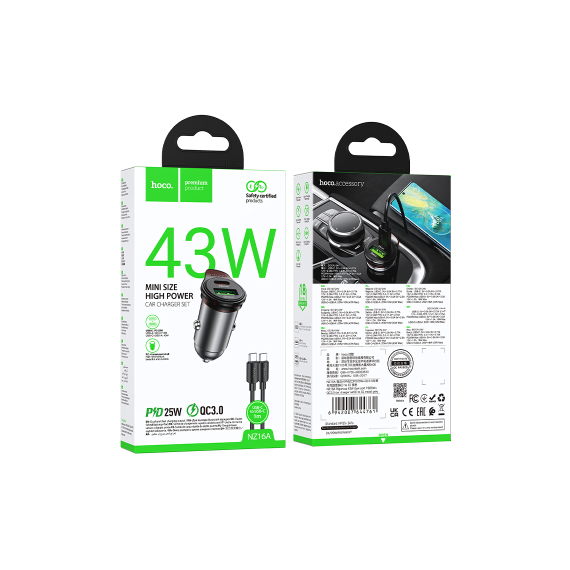 Hoco – încărcător auto 43W pentru alimentare rapidă și sigură în timpul condusului. Design compact, potrivit pentru majoritatea autovehiculelor.
